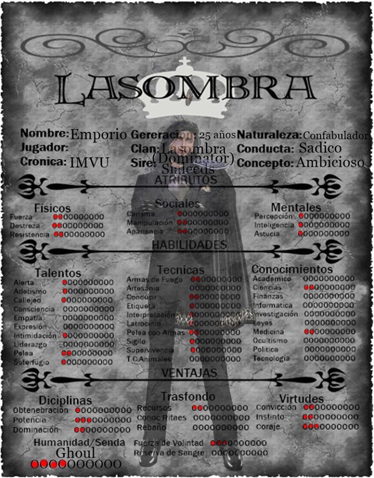 Vagó durante años deseando la muerte, pues no había conocido otra vida más que la de servir a los señores de la oscuridad, ninguna otra vida le parecía suficiente, de estar el la cúspide del poder y la ostentosidad, degradado a la vagancia sin sentido. pero el joven Emporio recordó aquellos enemigos de los Ventrue, los Lasombra descritos como seres sin piedad que odiaban profundamente a la humanidad. harto de la vida sin sentido, Emporio se adentro en los dominios Lasombra con la esperanza de encontrar uno que le arrebatará todo en segundos.